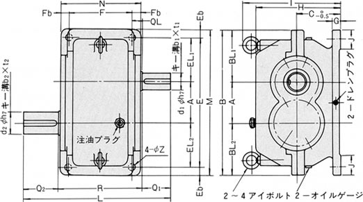 | 型式 | 減速比 | A | B | BL1 | BL2 | C | H | I | G | M | E | EL1 | EL2 | Eb | N |